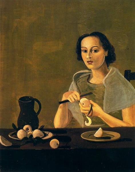 The Girl Cutting an Apple - The discrepancy between his last works and the earlier ones may be explained by his continued effort to find an atemporal art, distinctly distant from any period, and to emphasize the decorative nature of the canvas.