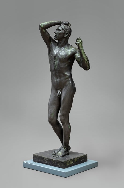 THE AGE OF BRONZE - This is a sculpture of a nude man squeezing his fists, with his right hand on his head. A representation of suffering in the midst of hope for the future.