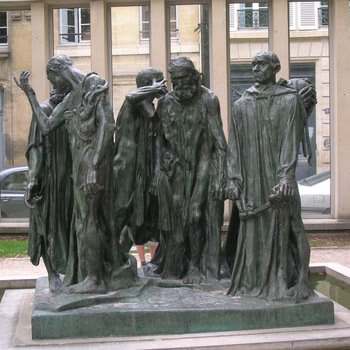 THE BURGUESES OF CALAIS - The work, which includes six human statues, depicts a war story in which six French citizens of Calais were ordered by King Edward III of England to leave their homes and surrender - barefoot and with their heads uncovered, wearing ropes around their necks and holding the keys to the city and the castle in their hands - to the king, who should then order their execution. 'The Burgesses of Calais' is a portrait of the moment when the citizens left the city; the group was later spared from death due to the request of Queen Philippa.