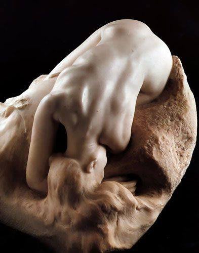 DANAE - The mythological story of Danae is often described in art. With this image, Rodin does not enter so much into the story of the myth, but he created mainly a feminine landscape pointing to the curve of the back and the neck. He shows his desperation; exhausted, she rests her head on her arm, 'like a huge sob',. A beautiful flowing image also called 'Spring'.
