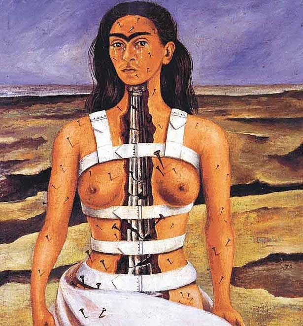 Penetrando da cintura até o queixo, a coluna parece fálica, e a conotação sexual é ainda mais óbvia por causa da beleza dos seios e do torso de Frida.