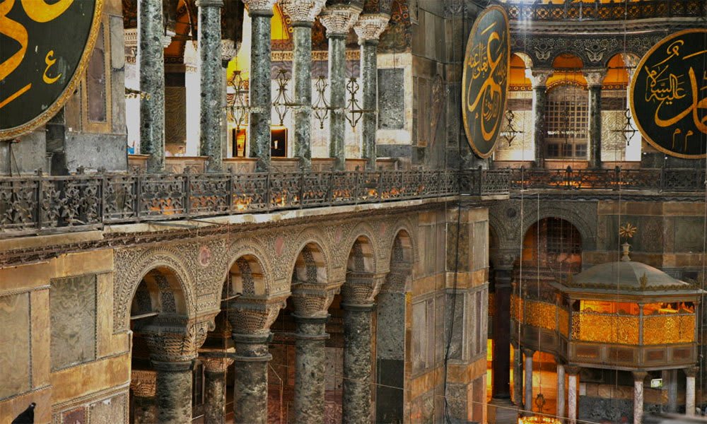 Por expreso mandato del Imperador Justiniano, ocho majestuosas columnas "Corintias" fueron desmanteladas en Baalbek, en el Líbano, y trasladadas a Constantinopla para embellecer esta obra magna. El suelo de la basílica, un auténtico lienzo, se halla recubierto de mármoles policromáticos en tonos verdes y blancos, salpicados de pórfido púrpura, además de mosaicos dorados. Y como centinelas de la inmensa cúpula, se alzan sus cuatro minaretes, erigidos con una exquisita combinación de ladrillo rojo, caliza blanca y arenisca.