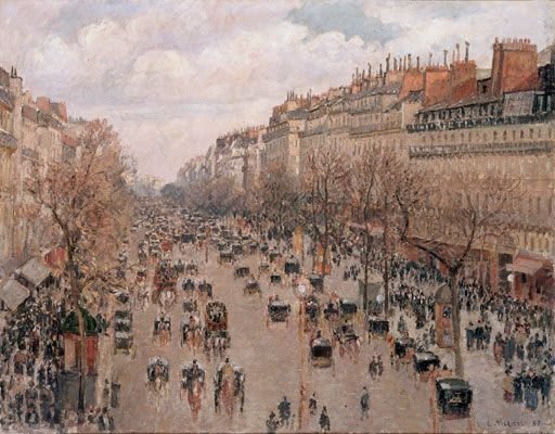 O Boulevard Montmartre - A tela faz parte de uma série de pinturas, retratadas no quarto de Pissarro do Hotel de Russie com vista para a rua, que retratam a mesma cena em diferentes pontos do dia e diferentes estações do ano. Ele enfatiza os efeitos cambiantes da luz natural sobre o cenário urbano, resultando em uma reflexão sobre a passagem do tempo e a transformação da cidade.