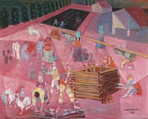 Ao pintar essa "Festa de São João", Portinari criou uma composição toda trabalhada com triângulos em tons de rosa, para homenagear São Pedro e a fogueira quadrada sendo montada ao estilo de Santo Antônio.