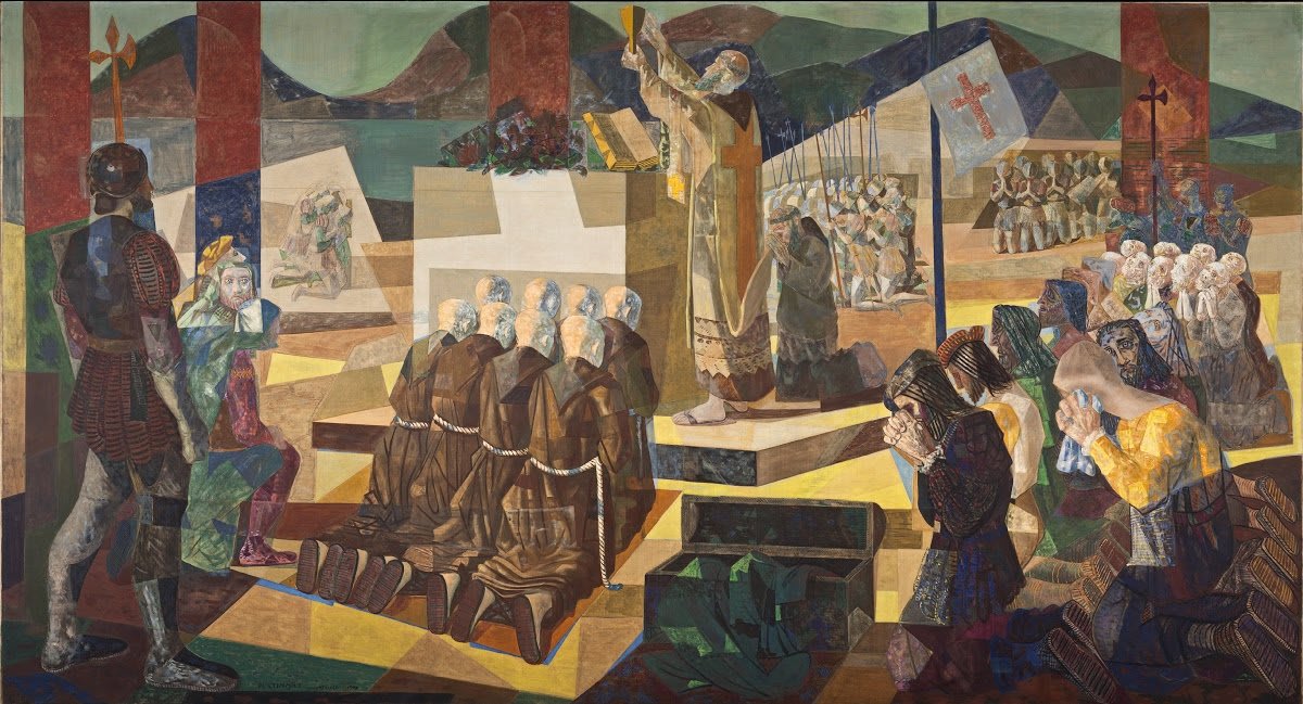Primeira Missa no Brasil - O painel de Portinari que representa a primeira missa no Brasil, foi realizado através de uma encomenda ao artista por Thomaz Oscar Pinto da Cunha, o terceiro Barão de Saavedra para compor o prédio que havia terminado de ser construído e projetado por Oscar Niemeyer em 1946, para funcionar a sede do Banco Boavista no Rio de Janeiro.