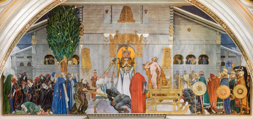 En 1911, sus bocetos para Midvinterblot fueron rechazados. La pintura retrata una leyenda de la mitología nórdica en la que el rey sueco Gustav Vasa es sacrificado para evitar el hambre, durante el Solsticio de Invierno.