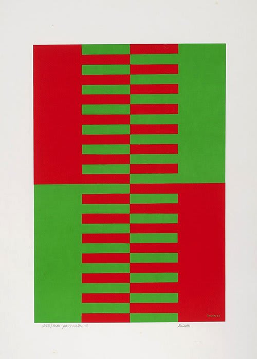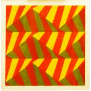 En la grabado a continuación, por ejemplo, Sacilotto coloca lado a lado, el rojo con su complementario, en pigmento, el verde.