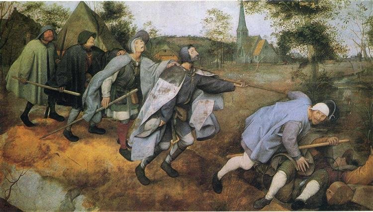 A Parábola dos Cegos - Essa é uma das últimas pintura de Bruegel que foi baseada no Evangelho (Matheus 15:14): "Deixem-nos, são cegos conduzindo outros cegos, mas se um cego conduz outro cego, ambos cairão num abismo". Bruegel quis apresentar através dessa obra, a cegueira espiritual em relação à religião: seis cegos caminham em desespero, como atesta a expressão de seus rostos. A queda do primeiro cego que está guiando, demonstra que ele é a primeira vítima dessa cegueira espiritual.