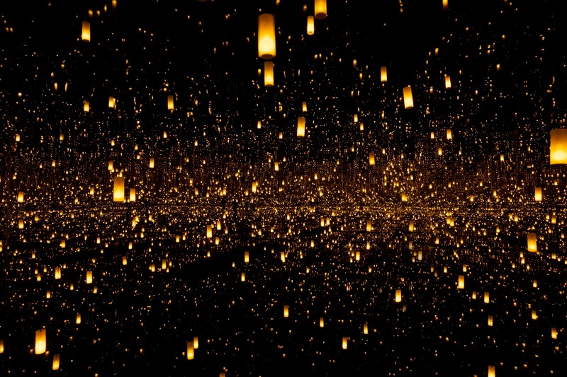 Kusama trabalha com inúmeras modalidades artísticas, como pintura, colagem, escultura, vídeo, performance, instalação, moda, literatura e música. Ela utiliza padrões repletos de pontos que cobrem as superfícies com repetição incessante, que visam sobrecarregar os sentidos. Os espelhos criam espaços vertiginosos que duplicam o nosso olhar.