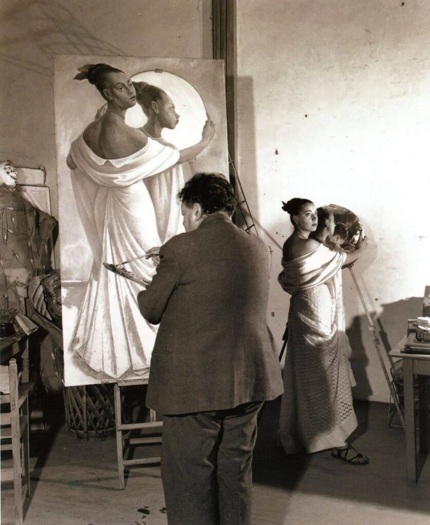 Temos aqui uma foto de Diego Rivera em seu estúdio em 1949, pintando sua filha Ruth Rivera, fruto de seu segundo casamento com Guadalupe Marín.