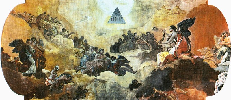Essa luz destaca um triângulo equilátero, envolto por um brilho radiante, que contém o símbolo de Deus Pai, com seu nome escrito em quatro letras do alfabeto hebraico.