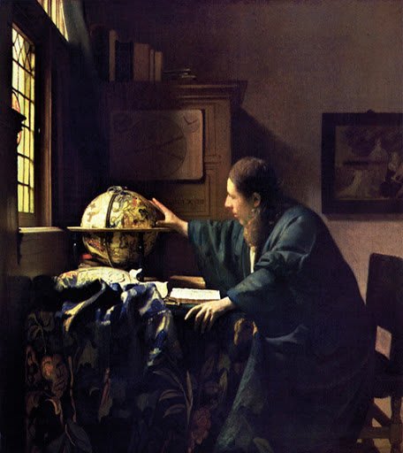 O Astrónomo - O ambiente criado por Vermeer, é embalado por uma luz suave lateral, a mão no globo celeste do cientista, é cercado por objetos habilmente ordenados e descritos com realismo. O astrónomo tende a uma estilização próxima da alegoria, e para isso contribui a fina combinação dos elementos que o rodeiam.
