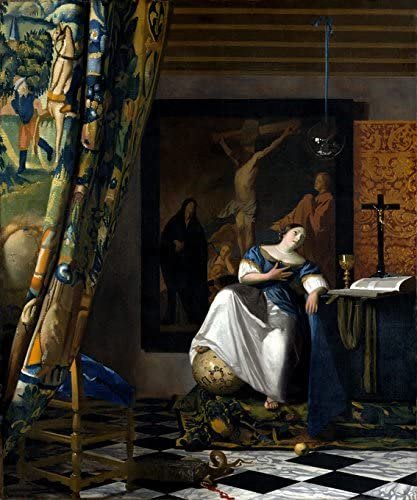 Alegoria da Fé Católica - Vermeer representa nessa pintura Maria Madalena que é mostrada erguendo os olhos da Bíblia para contemplar o crucifixo, paralisada pelo amor divino.