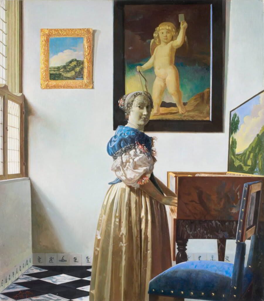 Dama de pé tocando Virginal - O virginal, instrumento musical pertencente à família do cravo, traz um significado muito importante nessa composição, pois era muito usado por moças de famílias abastadas que tocavam em ambiente familiar. As pinturas em que o artista incluía mulheres cercadas de elementos do universo musical,
