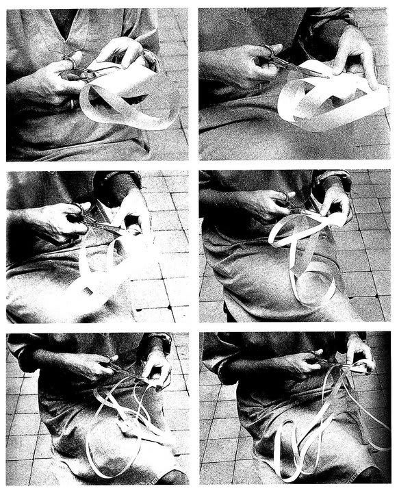 Depois de cortar o primeiro comprimento (basicamente uma circunferência de um círculo), o participante (que agora se tornaria o autor da obra, passou a desafiar as noções preconcebidas de autoria artística), ele deveria escolher direcionar sua tesoura para a esquerda a sua direita do corte existente.