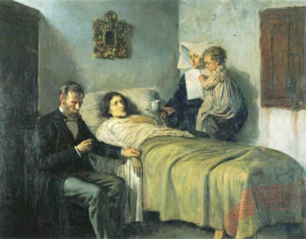 Um detalhe curioso: o médico que examina o pulso da paciente foi modelado a partir do próprio pai do artista, reconhecível pelo cabelo avermelhado.