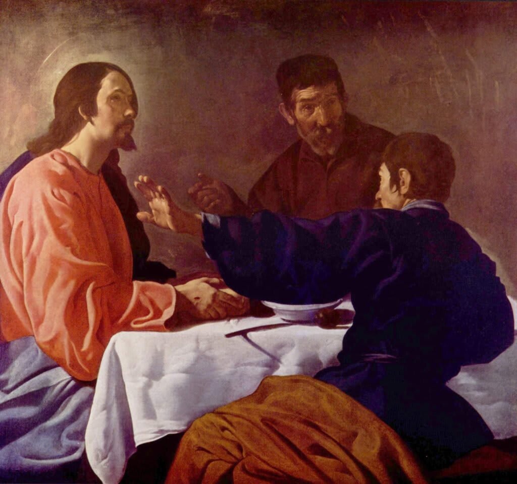 Christ is depicted in the moment of recognition by two disciples after his resurrection.