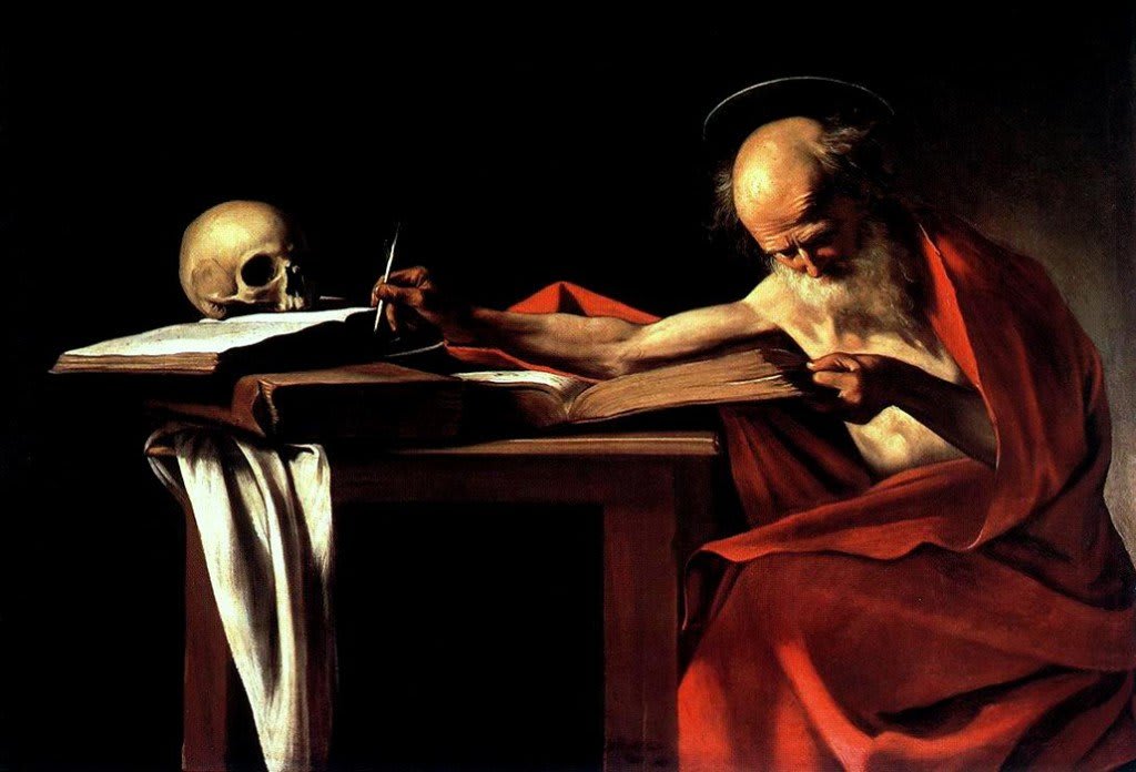 São Jerônimo - Essa pintura revela o santo em um ambiente austero e no processo de escrita. Ele está esticando o braço magro e musculoso para juntar tinta na pena, concentrando-se no que está fazendo. O crânio na mesa é um lembrete da nossa mortalidade.