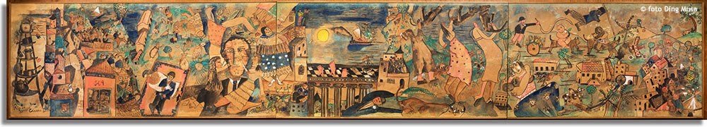 During this period, he painted a panel considered his masterpiece – I Saw the World... It Began in Recife – which was exhibited at the Revolutionary Salon of the National School of Fine Arts. The work caused controversy and protest but marked a significant moment in the history of modernism in Brazil. It was created using gouache and watercolor on ocher-colored wrapping paper. The artist explained: "What lived inside me was the dream. Contradictions that nature created: the invisible and the visible."