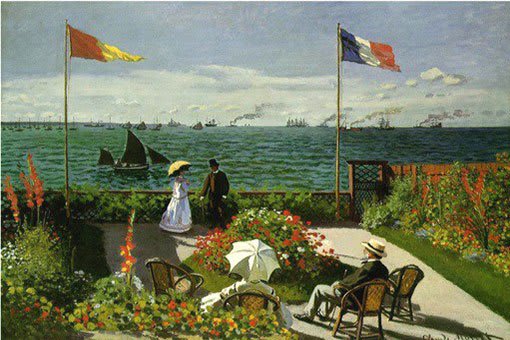 Em "Terraço em Sainte-Adresse", Monet combina diversos elementos: o sol, o mar, as flores e as figuras humanas.