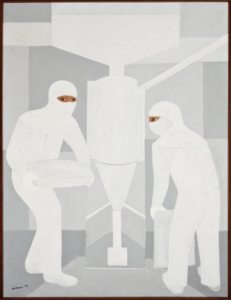 Es su manera de revelarnos que son, sí, humanos, pero a la vez extraños a nuestra mirada. Los percibimos solo como pescadores, futbolistas, obreros fabriles. Desconocemos sus pensamientos, sus emociones, sus percepciones; solo aquello que ejecutan. Al despojarlos de su individualidad, Djanira teje imágenes inquietantes de seres modernos, engranados en interacciones sociales, repetitivas hasta el hastío. Son figuras distantes, apartadas, puestas por ella para conformar una escena, nunca para ser sus protagonistas.