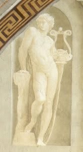 Uma outra curiosidade é o próprio edifício que é representado em forma de cruz grega, com as figuras em primeiro plano e o interior recuando atrás delas. As figuras estão espalhadas por degraus e passarelas e o afresco é emoldurado por um arco romano decorado com arabescos.