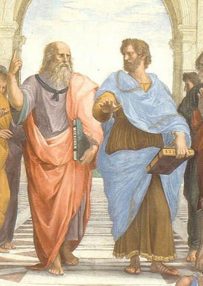 À direita está Platão segurando em sua mão esquerda, uma cópia encadernada de Timeu e é representado como um homem mais velho, sábio e grisalho. O fato de estar apontando para o alto com a mão direita, indica o mundo das ideias. Em contraste, seu aluno Aristóteles é mostrado como um homem mais jovem olhando para seu professor. Aristóteles carrega uma cópia encadernada da Ética Nicomaqueia na mão esquerda e caminha um pouco à frente de Platão, está direcionando o livro para baixo, o que indica o mundo terrestre. Platão gesticula para cima no cofre, enquanto Aristóteles gesticula horizontalmente à frente das figuras, eles conversam profundamente.