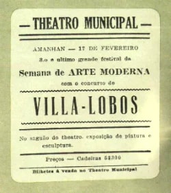 Heitor Villa-Lobos was the main figure in music during the Semana de Arte Moderna in 1922. During this event, he showcased his work over three days of performances. Among the works presented were the notable: Second Sonata, African Dances, Mystical Waltz, Cascavel, Third Quartet, and others.