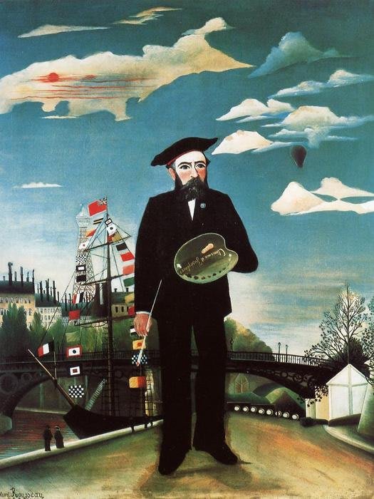 Eu, Retrato-paisagem - Aqui, Rousseau captura o auge da grandeza a que aspirava como pintor, apresentando-se em escala descomunal com pincel e paleta nas mãos e vestindo terno e boina de artista tradicional, diante de uma paisagem que apresenta a Torre Eiffel e um navio de mastro alto decorado com bandeiras de diferentes países.