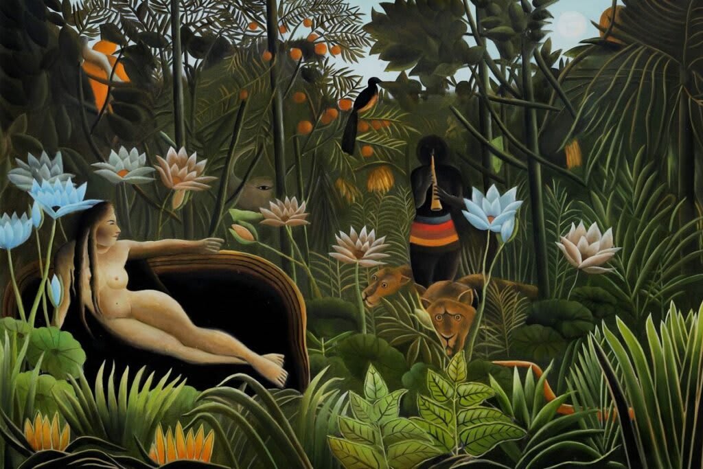 O Sonho - “A mulher adormecida no sofá sonha que foi transportada para a floresta, ouvindo os sons do instrumento do feiticeiro”, escreveu Rousseau sobre essa pintura enigmática.