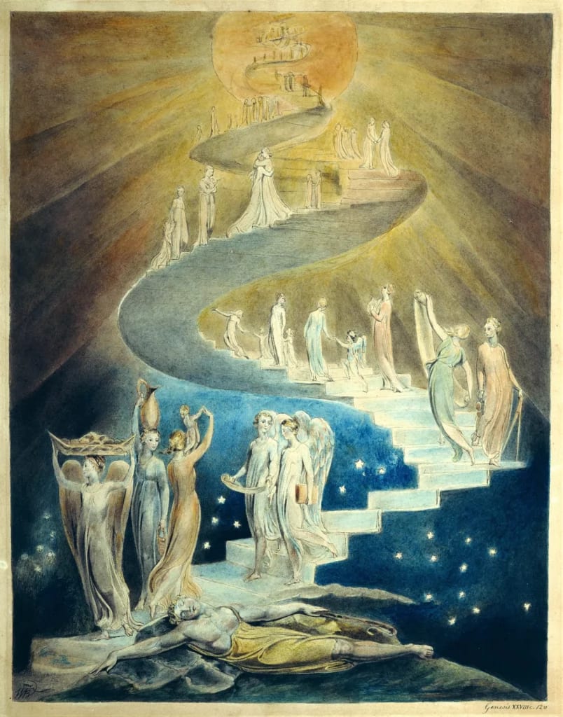 The dreamlike quality of this scene belongs not only to the symbolist style of Blake, but also to the dream that Jacob is having, lying on a sweet head in an unknown place after a long day of travel.
