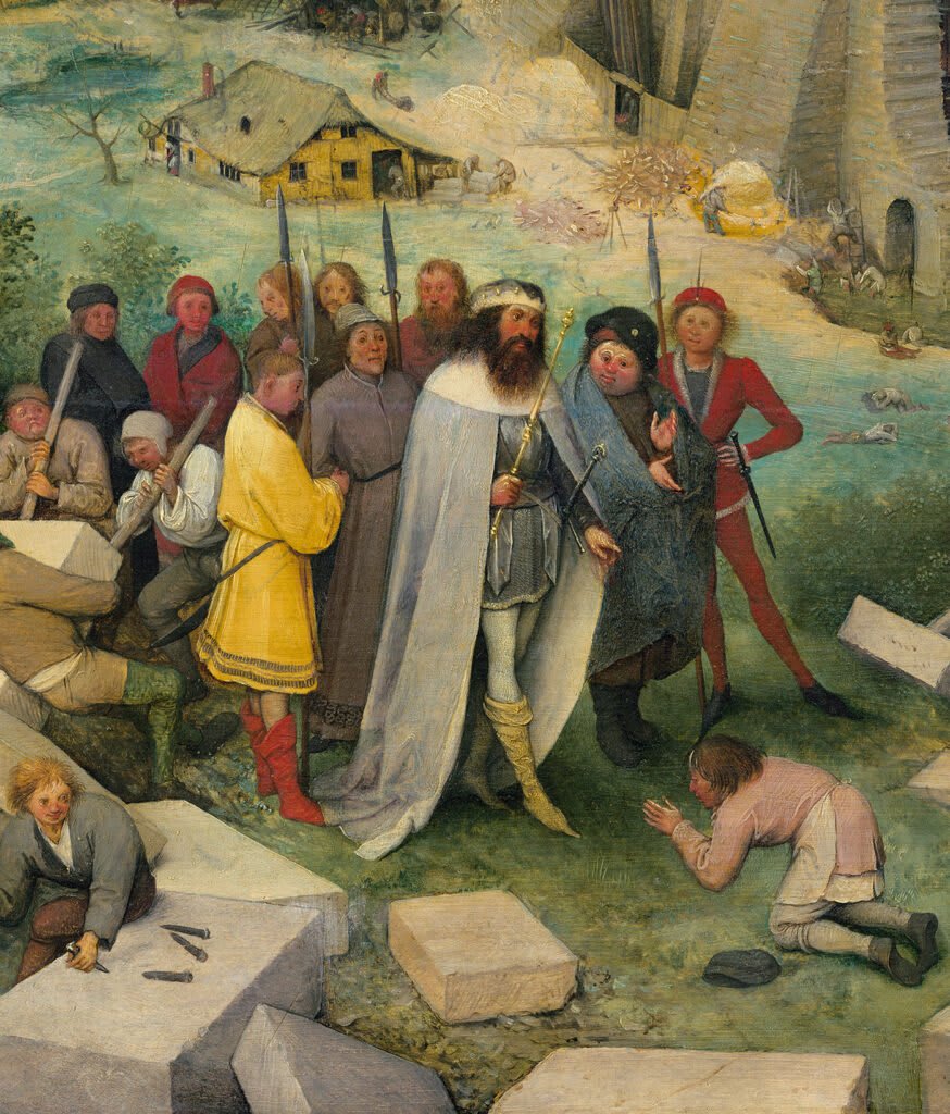 El Rey Nimrod vestido a la moda renacentista es una evocación del Rey Felipe II de España, que gobernaba la Holanda en ese tiempo. En la esquina inferior izquierda, el Rey Nimrod está visitando el sitio de la obra. Está acompañado por su arquitecto y los guardias mientras los trabajadores le rinden homenaje.