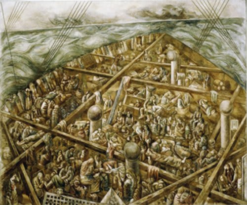 In Navio de Emigrantes, there are some peculiar and interesting aspects to be observed: see how all the characters portrayed in the work are looking in the opposite direction of where the ship is going: some with a lost look, others looking down or sleeping, with a look of desolation, or even those who are ill. Everyone, without exception, turns their backs to their destination.