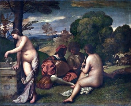 Manet deliberately evokes Renaissance paintings of sensual leisure, but updates the entertainment to show bohemian gentlemen of his own class accompanied by women who can be prostitutes.