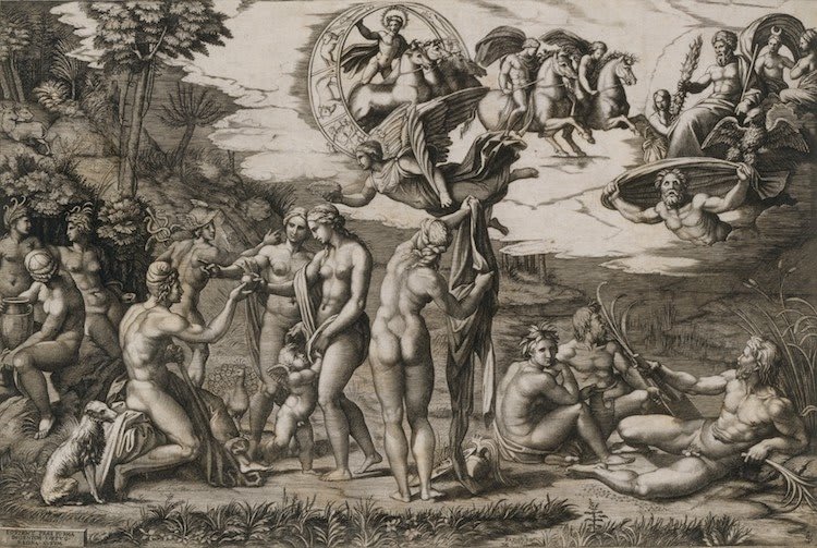 Regarding the print, it is a work by Raphael that was lost over time, in which Marcantonio Raimondi, copied to make the composition of this print.