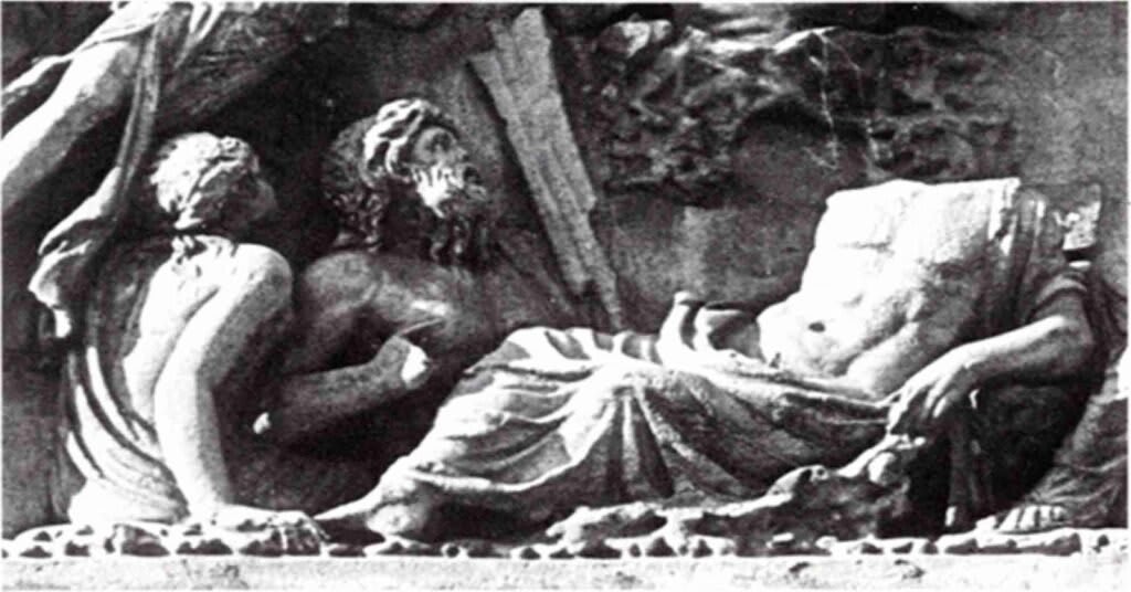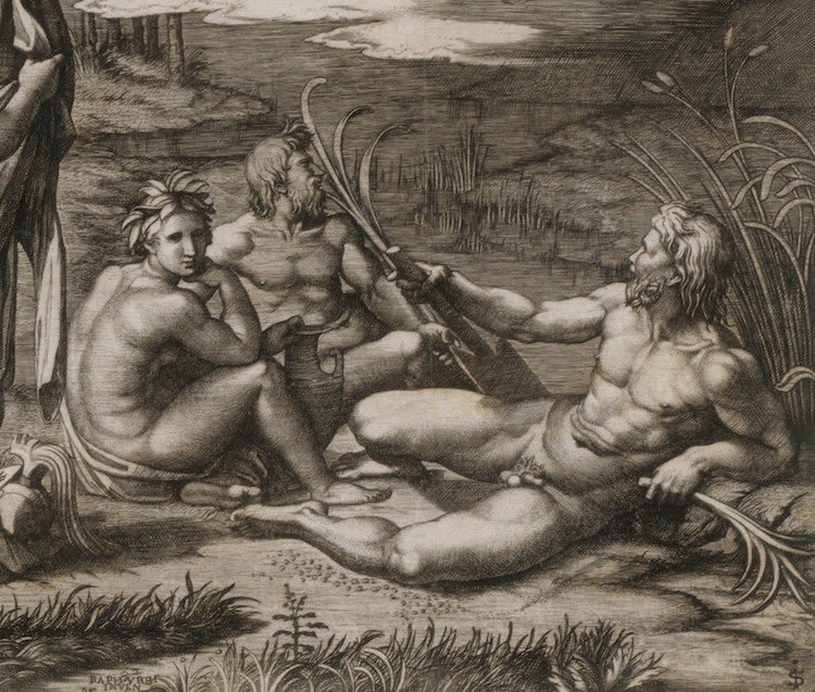 As we mentioned in the text, three of his figures are based on part of a print by Marcantonio Raimondi, being that a copy of a composition now lost of Raphael Sanzio.