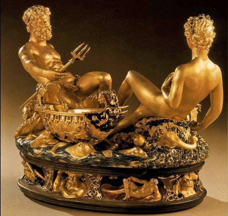 Benvenuto Cellini (1500-1571) - Cellini, un escultor italiano de peso, es universalmente reconocido como el orfebre más eximio de su tiempo. Fue también el autor de la célebre "Autobiografía". La pieza que aquí se ejemplifica fue bautizada como “obra maestra de la escultura manierista”, pero, a la vez, encarnaba el suntuoso estilo decorativo propio de la corte francesa.