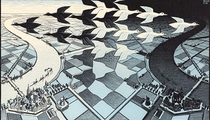 Dia e Noite - Campos cinzentos retangulares evoluem para cima, em silhuetas de aves brancas e pretas em um ciclo sem fim. Essa é uma reflexão utilizada por Escher nessa xilogravura pertencente à série Metamorfose