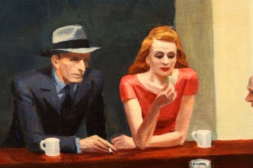Characterized by an open narrative, this painting embodies the artist's interest in themes of alienation, melancholy, voyeurism, and ambiguous relationships. The term Night Hawks is used figuratively to describe someone who stays up late, and it's a name that can naturally be associated with nocturnal birds, like falcons.