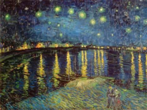 El lienzo Noche Estrellada sobre el Ródano nació en Arlés, al sur de Francia, justo el lugar adonde Van Gogh se había trasladado en pos de luz y color, nueve meses antes de su internamiento. A pesar de la exuberancia del azul y el amarillo, todo rezuma calma y esplendor; las luces naturales, emanadas de las estrellas, se funden con el dorado resplandor de las casas reflejado en el río. Las suaves ondulaciones del agua, ¡qué belleza!, crean una atmósfera romántica. El impacto visual es fulminante, una magia pura se establece al instante entre la obra y quien la contempla.