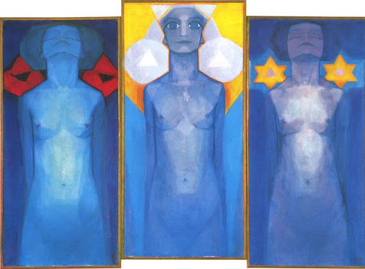 Evolução - Cada painel dessa pintura, apresenta uma mulher nua de forma simbólica, onde podemos observar Estrelas de David, triângulos místicos e hexágonos. A Teosofia influenciou diretamente seu estilo representacional, expresso em pinturas de flores, e mais especificamente nessa obra que ecoa o ciclo budista e teosofista de morte e renascimento. Mondrian explicou: "O tempo todo sou levado ao espiritual. Por meio da Teosofia, percebi que a arte poderia fornecer uma transição para as regiões mais sutis, que chamarei de reino espiritual."