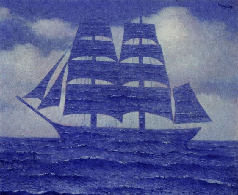 O Sedutor - A pintura apresenta um navio que parece flutuar sozinho em um mar ideal, cercado por um dos motivos favoritos de Magritte, as nuvens.