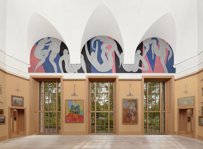 In 1931, the doctor and art lover Albert Barnes, hired Matisse to paint a mural for the main corridor of his gallery with works by Vincent van Gogh, Paul Cézanne and others. Matisse created a maquette for the mural on cut paper, which he could reorganize while determining the composition. However, the final work was too small for the space due to incorrect measurements. Instead of adding a decorative border, Matisse decided to re-compose the entire piece, resulting in a dynamic composition, in which the bodies appear to jump through an abstract space of pink and blue fields.