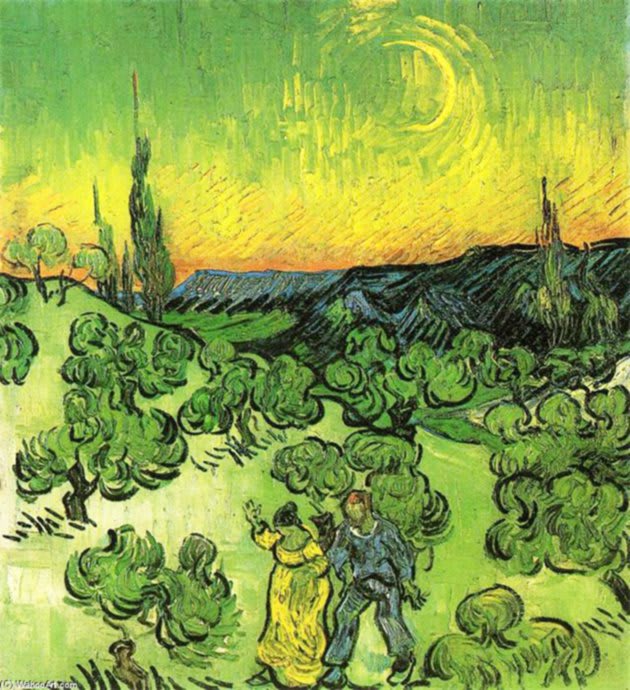 A obra Paisagem com casal caminhando e lua crescente foi criada em maio de 1890, durante sua estadia no Sanatório de Saint-Rémy.