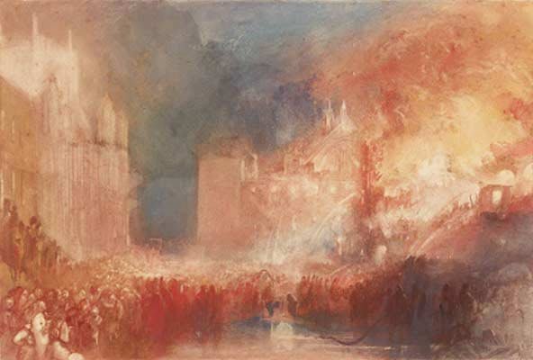 A Queima das Casas do Parlamento - Em 1834, um incêndio tomou conta das Casas do Parlamento e queimou durante horas, enquanto os londrinos assistiram ao evento terrível. Turner fez uma série de esboços e pinturas da tragédia vista do Rio Tamisa. O artista apresenta nessa obra uma visão mais próxima do fogo e aqueles se reuniram para assistir. Turner usa cor para transmitir a magnífica calor luz e: tanto o tema da pintura, como o caso de queima de construção em si, favorecendo os aspectos elementares do incêndio, assim como o próprio fogo, incorpora um de seus temas favoritos.