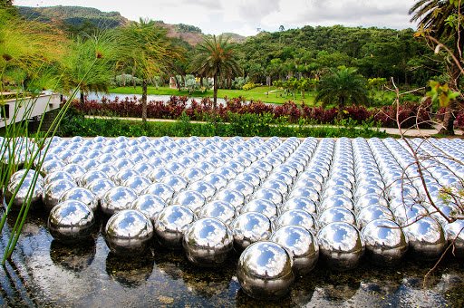 Foi construída a partir de 500 esferas de aço inoxidável que flutuam sobre o espelho d’água, criam formas que se movimentam com o vento e/ou outros fatores externos.